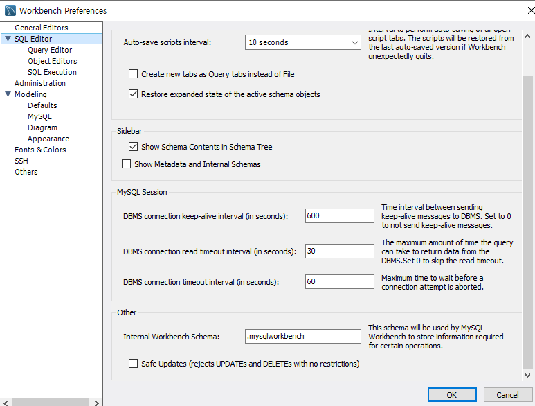 [SQL Editor] -> [Safe Updates (rejects UPDATEs and DELETEs with no restrictions)]를 체크 해제한 후 OK 버튼을 클릭합니다. 그 후 MySQL 워크벤치를 재시작해야 합니다.