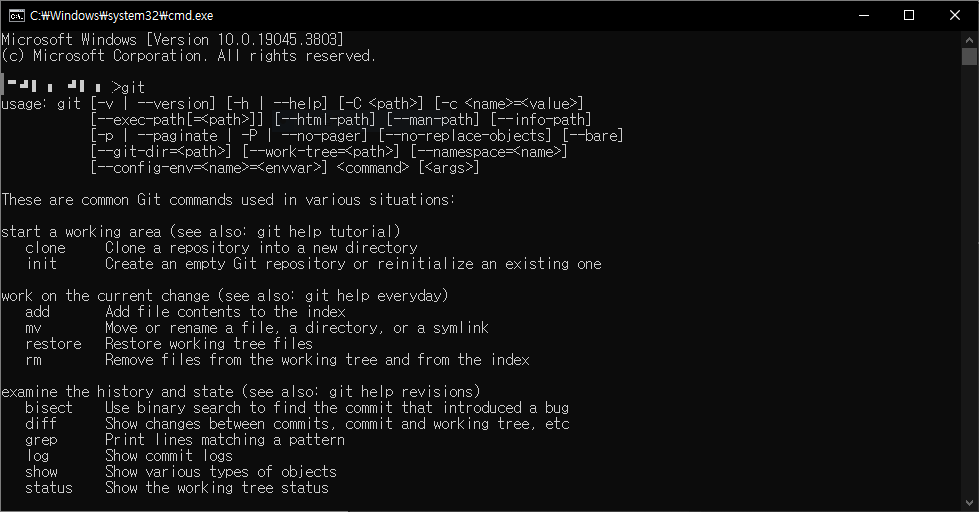 윈도우의 명령프롬프트에서 git이라고 입력하신 후 정상적으로 작동되는지 확인하는 방법이 있습니다.