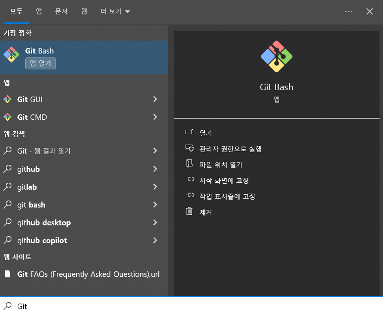 윈도우 버튼을 누르신 후 Git을 입력하여 제대로 설치되었는지 확인이 가능합니다.