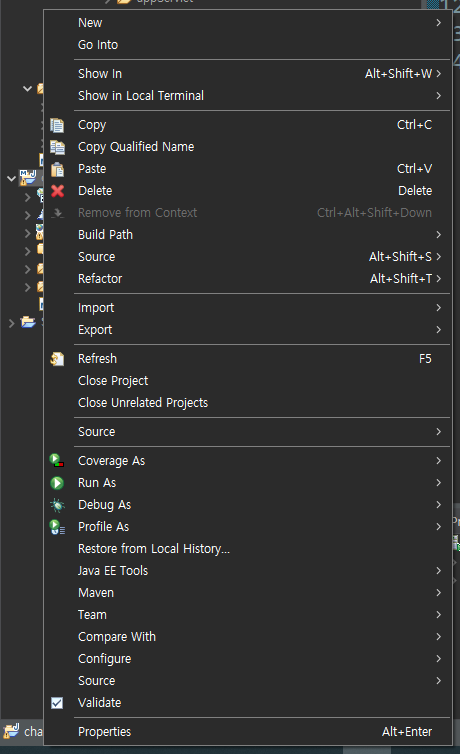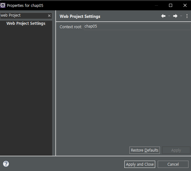 스프링 프로젝트의 이름은 chap05인데 이전 프로젝트의 이름이 웹 주소에 나타날 때가 있습니다. 이때 해결 방법입니다.
