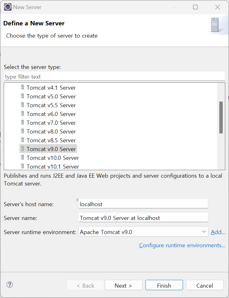설치하신 아파치 톰캣의 버전을 맞추어 서버를 새로 생성합니다.
