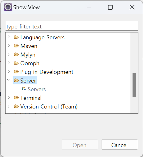 새롭게 컴퓨터를 포맷한 후 이클립스도 설치하고, Java 17도 설치하고, 아파치 톰캣도 설치를 마쳤습니다. 이제 이클립스에서 웹 애플리케이션 프로그래밍을 하기 위해서 서버를 시작하려고 하는데 Coose an existing server이 클릭이 안됩니다.