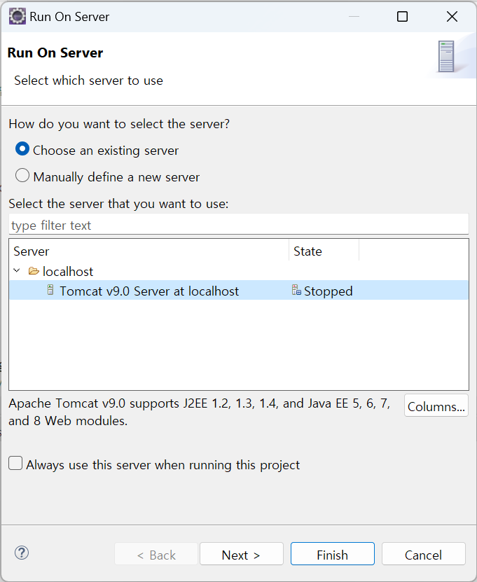 이클립스에서 Choose and existing server 클릭이 불가능한 경우 해결 방법 #아파치톰캣 본문