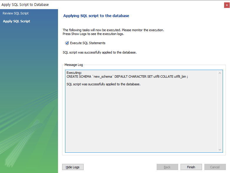 Finish를 클릭하면 스키마 생성이 완료됩니다.