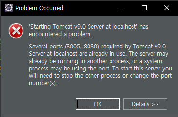 톰캣 9.0 버전에서 요구하는 포트들(8005, 8080)이 이미 사용되고 있습니다. 이 서버는 다른 프로세스에 의해 실행되거나 시스템 프로세스가 해당 포트를 사용중일 수 있습니다. 이 서버를 실행시키기 위해서, 당신은 다른 프로세스를 멈추거나 포트 번호를 바꾸셔야합니다.