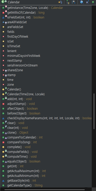 Calendar.class가 어떤 메서드를 가지고 있는지 메서드이름(파라미터) : 반환타입으로 확인이 가능합니다.